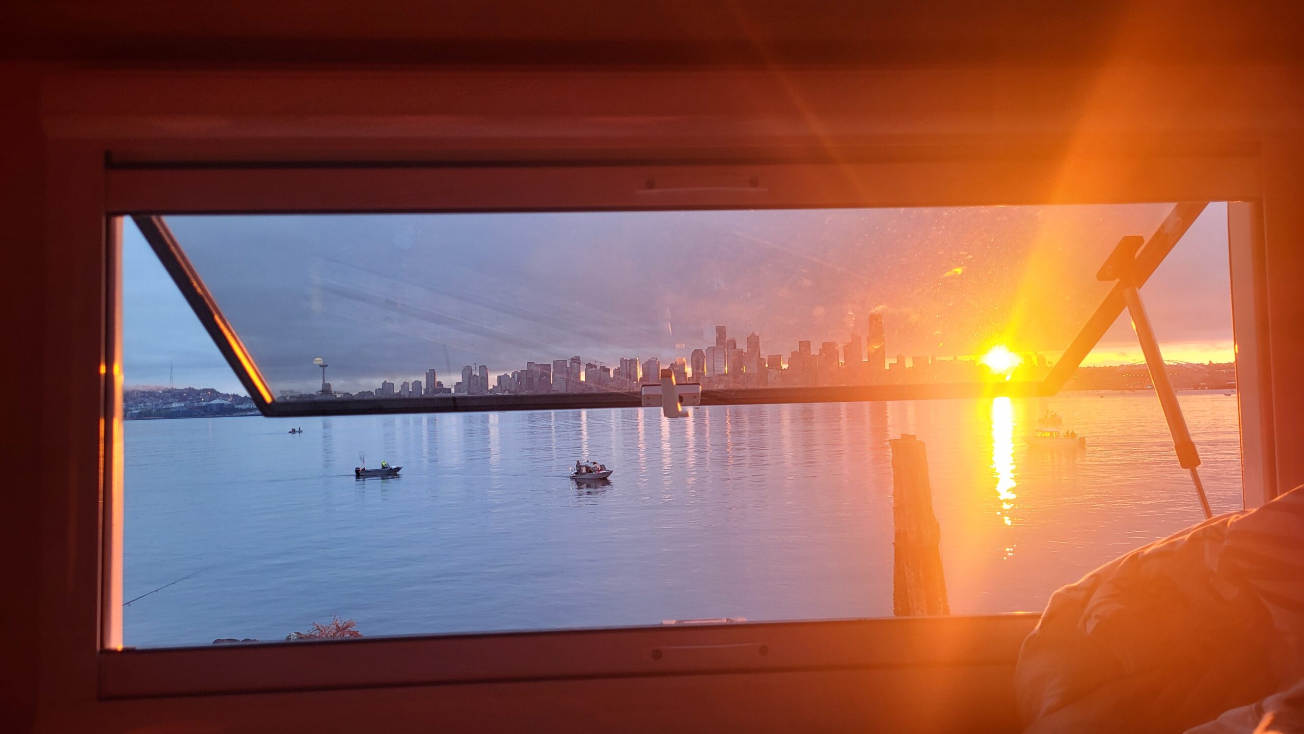 Bien que le panorama soit magnifique, notre bivouac, qui offre une vue imprenable sur la skyline de Seattle, s’avère étonnamment bruyant. Les allées et venues des habitants se succèdent une bonne partie de la nuit, parfois accompagnées de musiques à volume élevé. La nuit est donc courte ; nous assistons même au lever du soleil avant de nous rendormir jusqu’à 10 heures pour récupérer.
